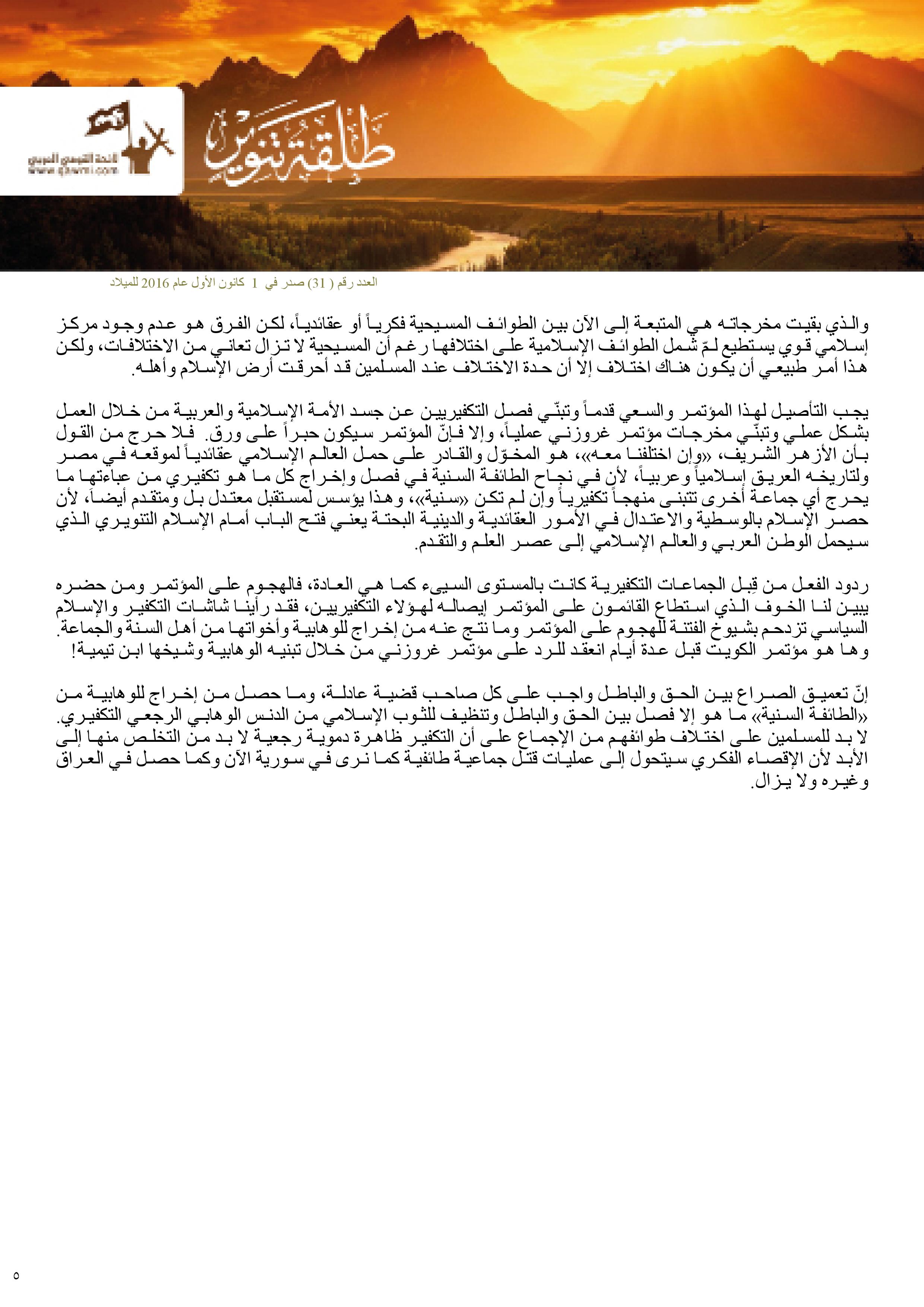 إنّ تعميق الصراع بين الحق والباطل واجب على كل صاحب قضية عادلة، وما حصل من إخراج للوهابية من “الطائفة السنية” ما هو إلا فصل بين الحق والباطل وتنظيف للثوب الإسلامي من الدنس الوهابي الرجعي التكفيري. لا بد للمسلمين على اختلاف طوائفهم من الإجماع على أن التكفير ظاهرة دموية رجعية لا بد من التخلص منها إلى الأبد لأن الإقصاء الفكري سيتحول إلى عمليات قتل جماعية طائفية كما نرى في سورية الآن وكما حصل في العراق وغيره ولا يزال.