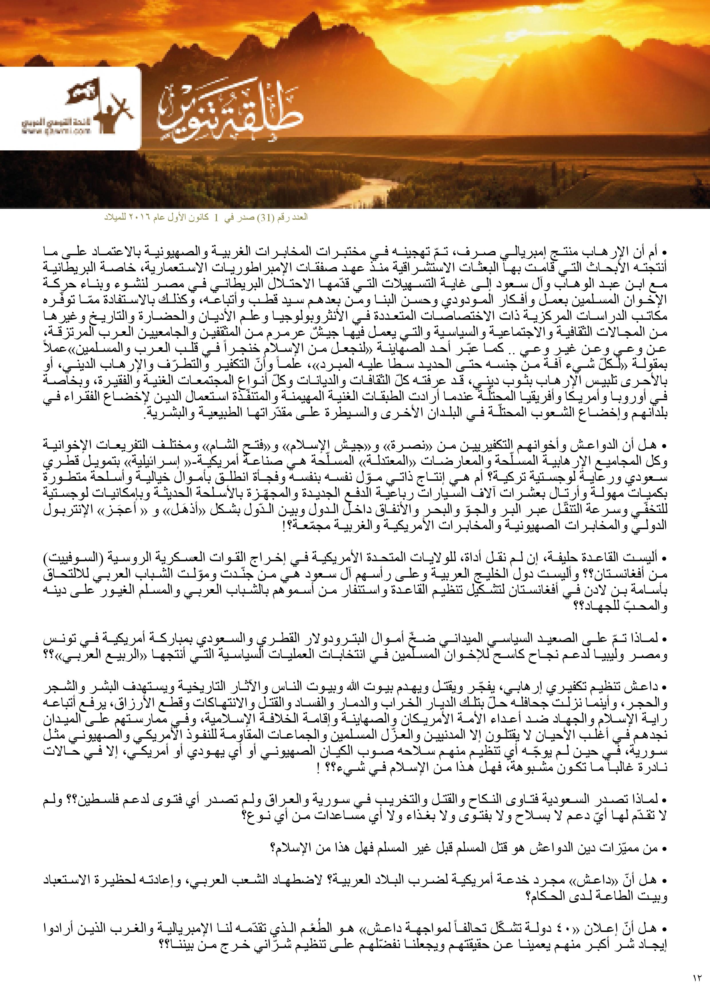 • هل أنّ إعلان “40 دولة تشكّل تحالفاً لمواجهة داعش” هو الطُعْم الذي تقدّمه لنا الإمبريالية والغرب الذين أرادوا إيجاد شر أكبر منهم يعمينا عن حقيقتهم ويجعلنا نفضّلهم على تنظيم شرّاني خرج من بيننا؟؟